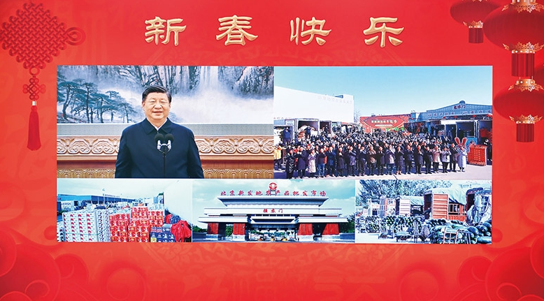 2023年1月18日,中共中央總書記、國家主席、中央軍委主席習(xí)近平在北京通過視頻連線看望慰問基層干部群眾,向全國各族人民致以新春的美好祝福。這是習(xí)近平通過視頻連線,同北京新發(fā)地農(nóng)產(chǎn)品批發(fā)市場的商戶和采購年貨的群眾親切交流。新華社記者 李濤/攝