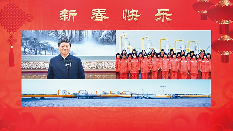 2023年1月18日,中共中央總書記、國家主席、中央軍委主席習(xí)近平在北京通過視頻連線看望慰問基層干部群眾,向全國各族人民致以新春的美好祝福。這是習(xí)近平通過視頻連線,同塔里木油田公司輪南油氣儲(chǔ)運(yùn)中心西氣東輸?shù)?一站克拉集氣區(qū)員工親切交流。新華社記者 李濤/攝
