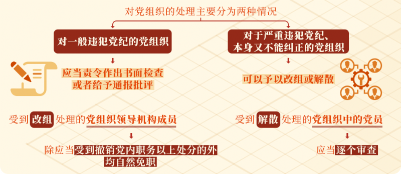 根據(jù)《中國共產(chǎn)黨紀律處分條例》規(guī)定,對黨組織的處理主要分為兩種情況:對一般違犯黨紀的黨組織,上級黨組織應當責令其作出書面檢查或者給予通報批評;對于嚴重違犯黨紀、本身又不能糾正的黨組織,上一級黨的委員會在查明核實后,根據(jù)情節(jié)的嚴重程度,可以予以改組或解散。