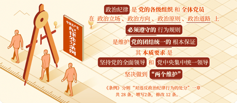 《中國共產(chǎn)黨紀(jì)律處分條例》第二編分則第六章是對違反政治紀(jì)律的行為的處分規(guī)定。新修訂的紀(jì)律處分條例第六章共 28 條,增寫2條,修改 12 條。