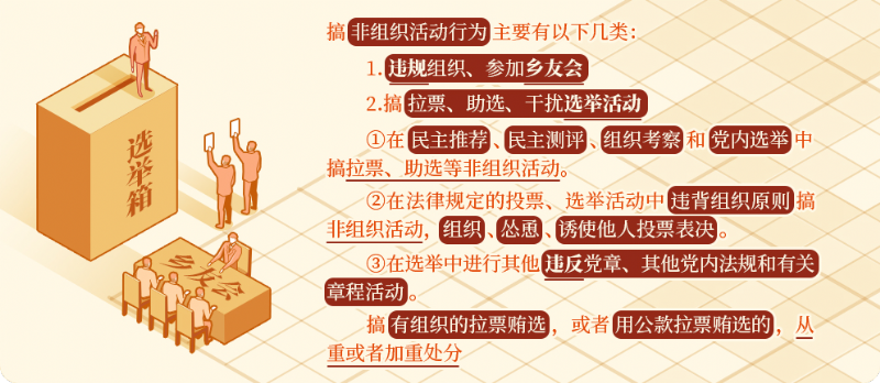 黨內(nèi)選舉是黨內(nèi)政治生活的重要組成部分。《關(guān)于新形勢下黨內(nèi)政治生活的若干準(zhǔn)則》規(guī)定,黨內(nèi)選舉必須體現(xiàn)選舉人意志,堅(jiān)決防止和查處拉票賄選等行為。在選舉活動中搞非組織活動,干擾選舉人表達(dá)選舉意愿,侵犯其他被選舉人權(quán)益,侵蝕黨內(nèi)政治文化,在黨員群眾中造成不良影響,對這類違反組織紀(jì)律的行為必須予以堅(jiān)決懲治。