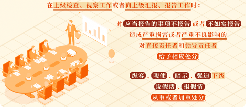 《中國共產(chǎn)黨紀(jì)律處分條例》第 一百四十條規(guī)定,在上級檢查、視察工作或者向上級匯報(bào)、報(bào)告工作時(shí),對應(yīng)當(dāng)報(bào)告的事項(xiàng)不報(bào)告或者不如實(shí)報(bào)告,造成嚴(yán)重?fù)p害或者嚴(yán)重不良影響的,對直接責(zé)任者和領(lǐng)導(dǎo)責(zé)任者,給予警告或者嚴(yán)重警告處分;情節(jié)嚴(yán)重的,給予撤銷黨內(nèi)職務(wù)或者留黨察看處分。在上級檢查、視察工作或者向上級匯報(bào)、報(bào)告工作時(shí)縱容、唆使、暗示、強(qiáng)迫下級說假話、報(bào)假情的,從重或者加重處分。