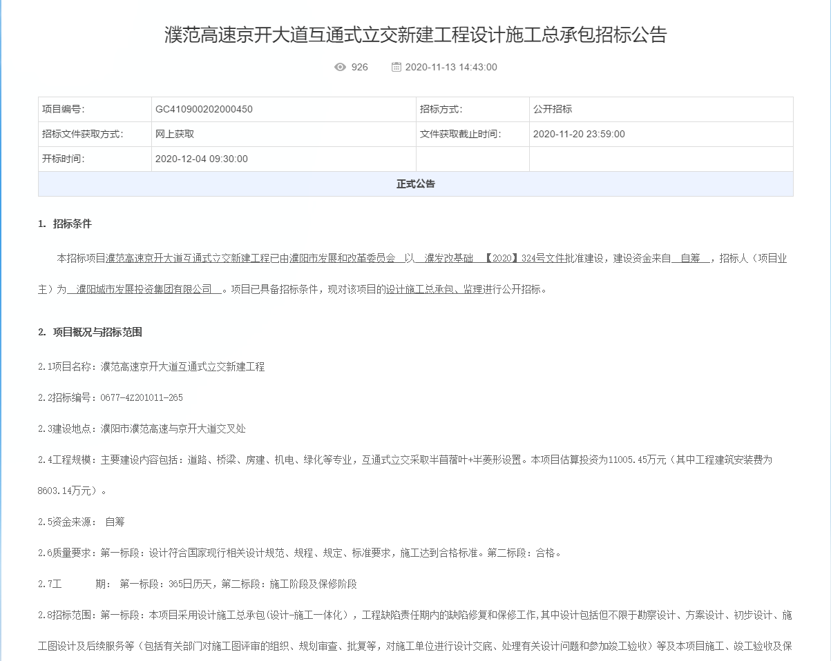 濮范高速京開(kāi)大道互通式立交新建工程項(xiàng)目掛網(wǎng)發(fā)布