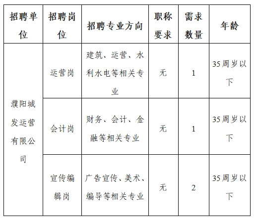 濮陽城發(fā)運營有限公司人才招聘公告